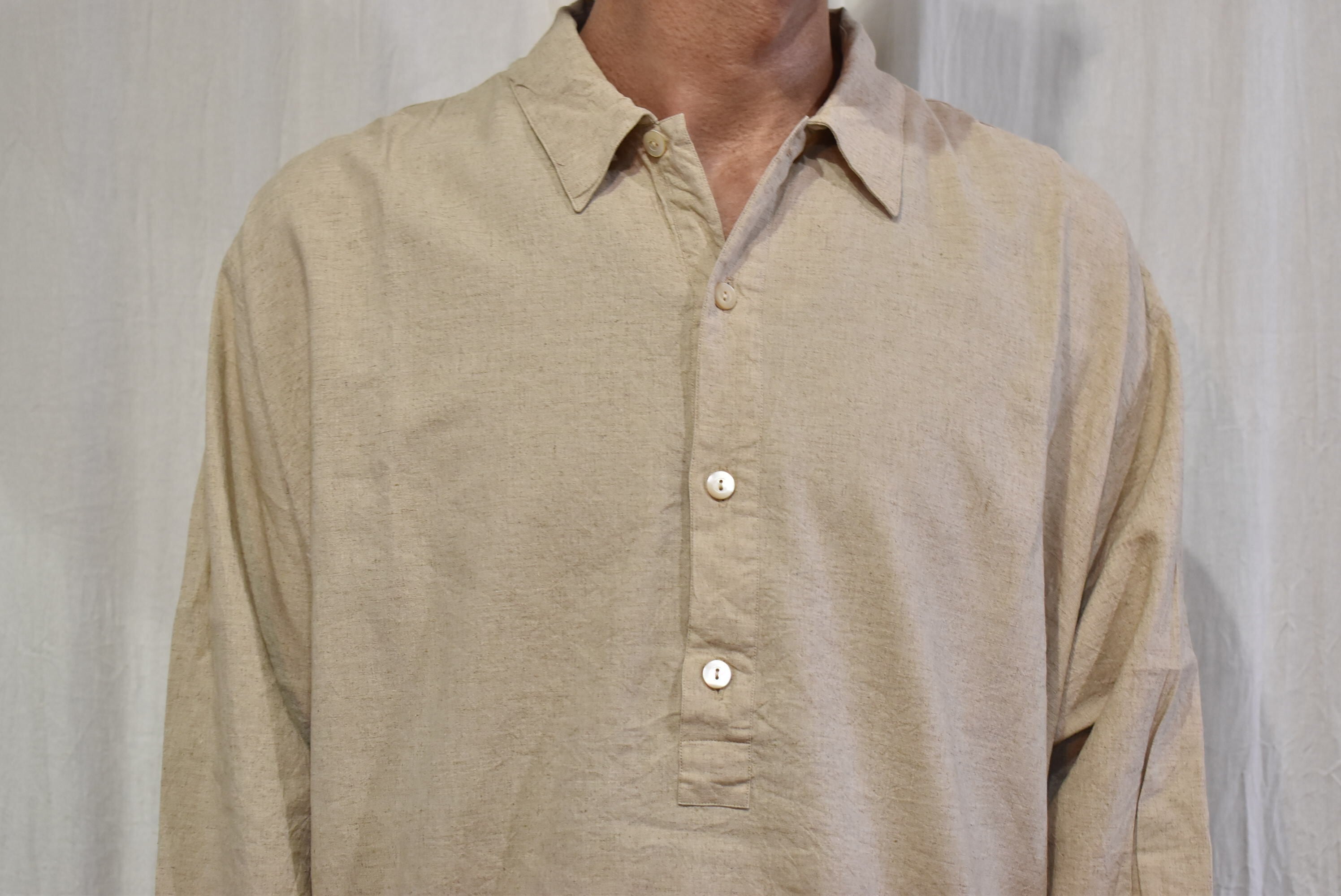 襟の位置を出来る限り前側に振ったプルオーバータイプのシャツ。
