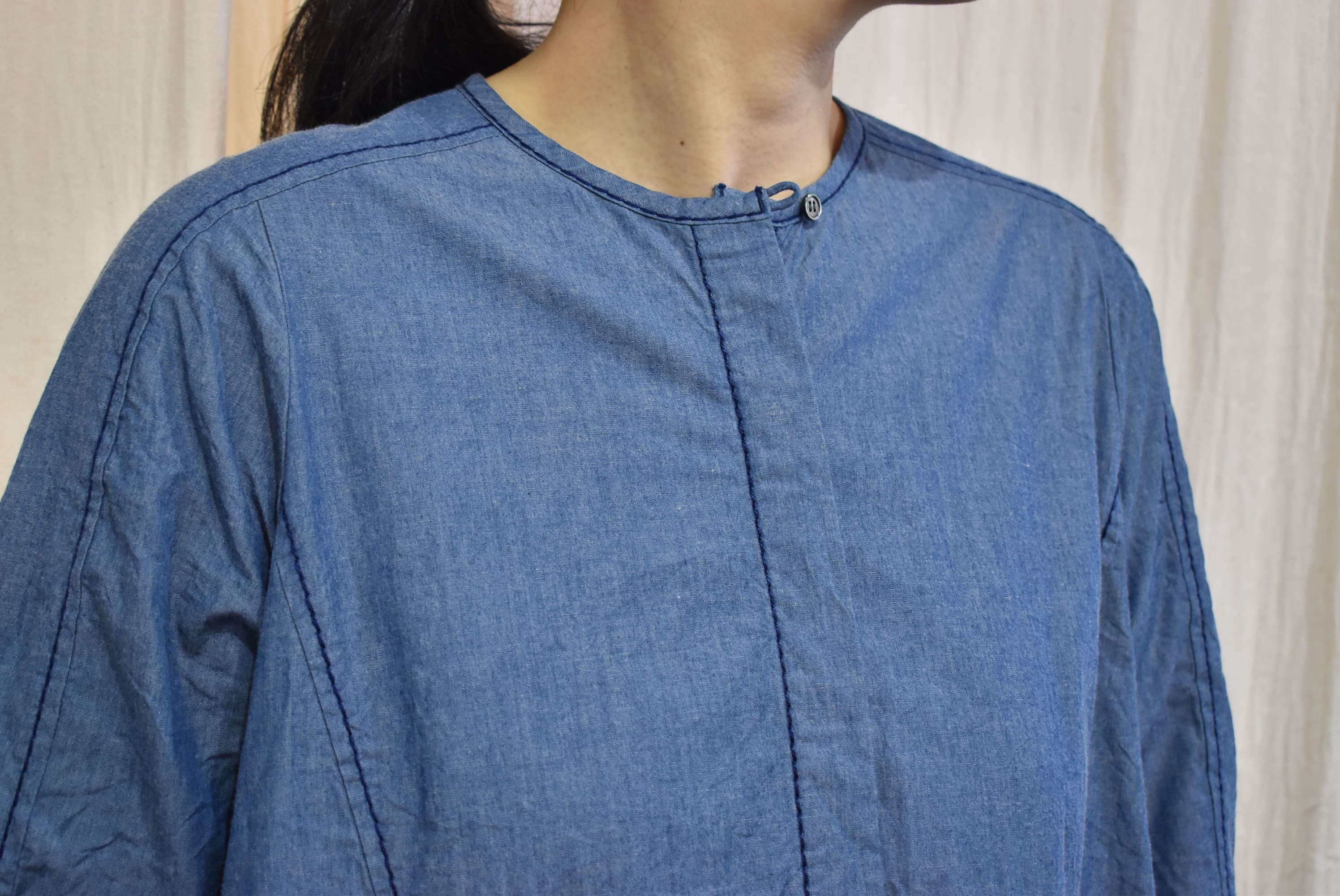 homspun : ライトオンスシャンブレー 七分袖比翼OP ブルー×ネイビー