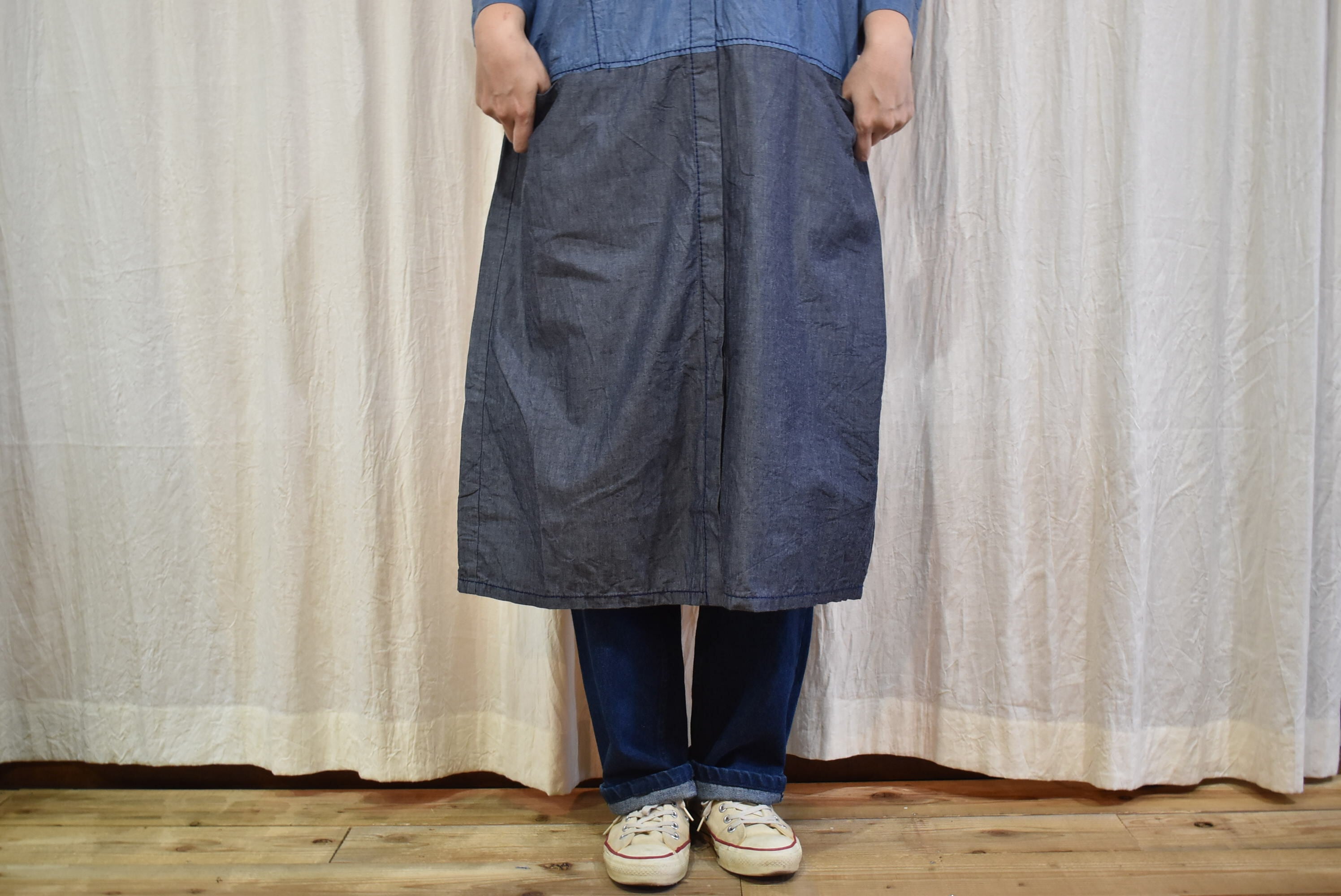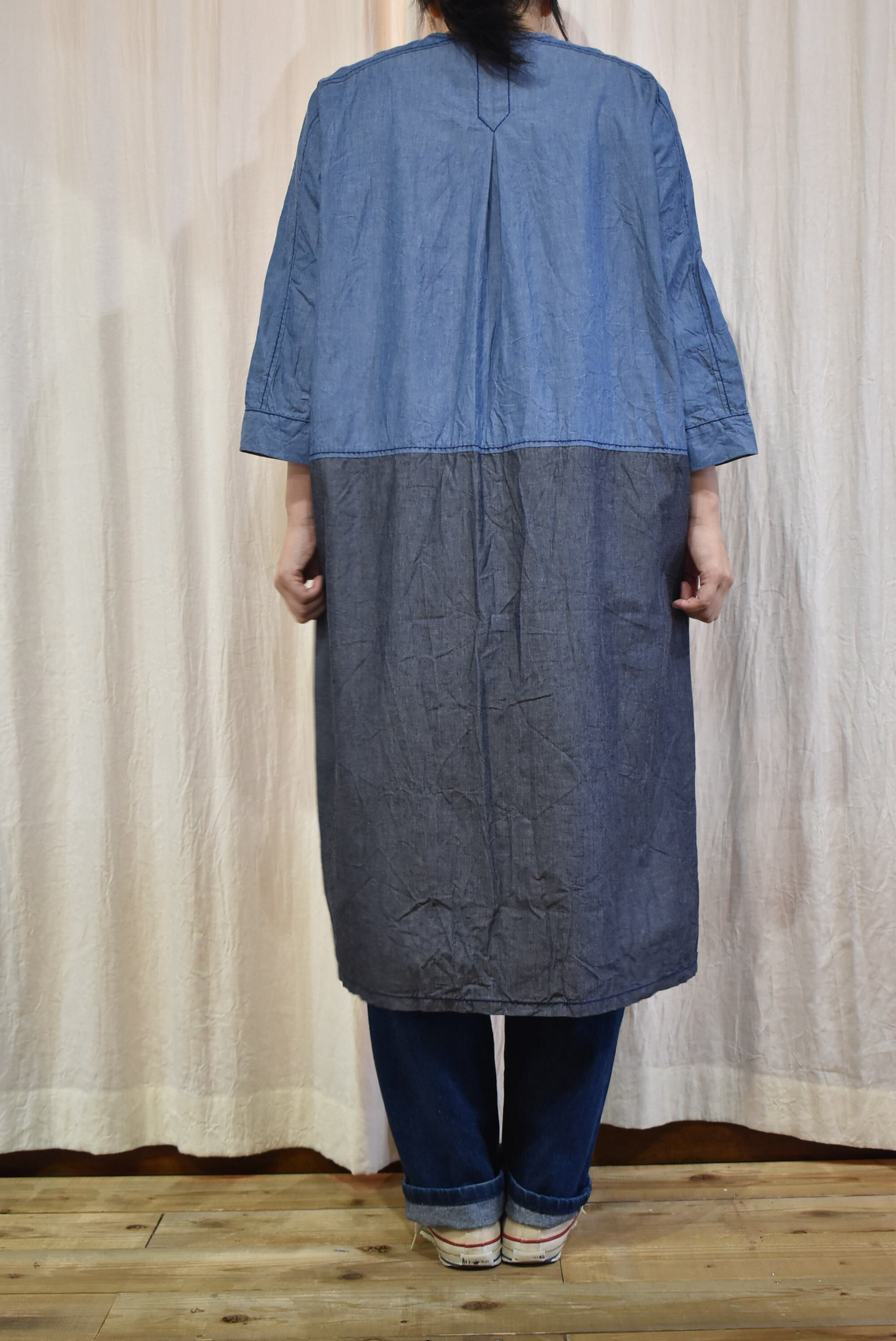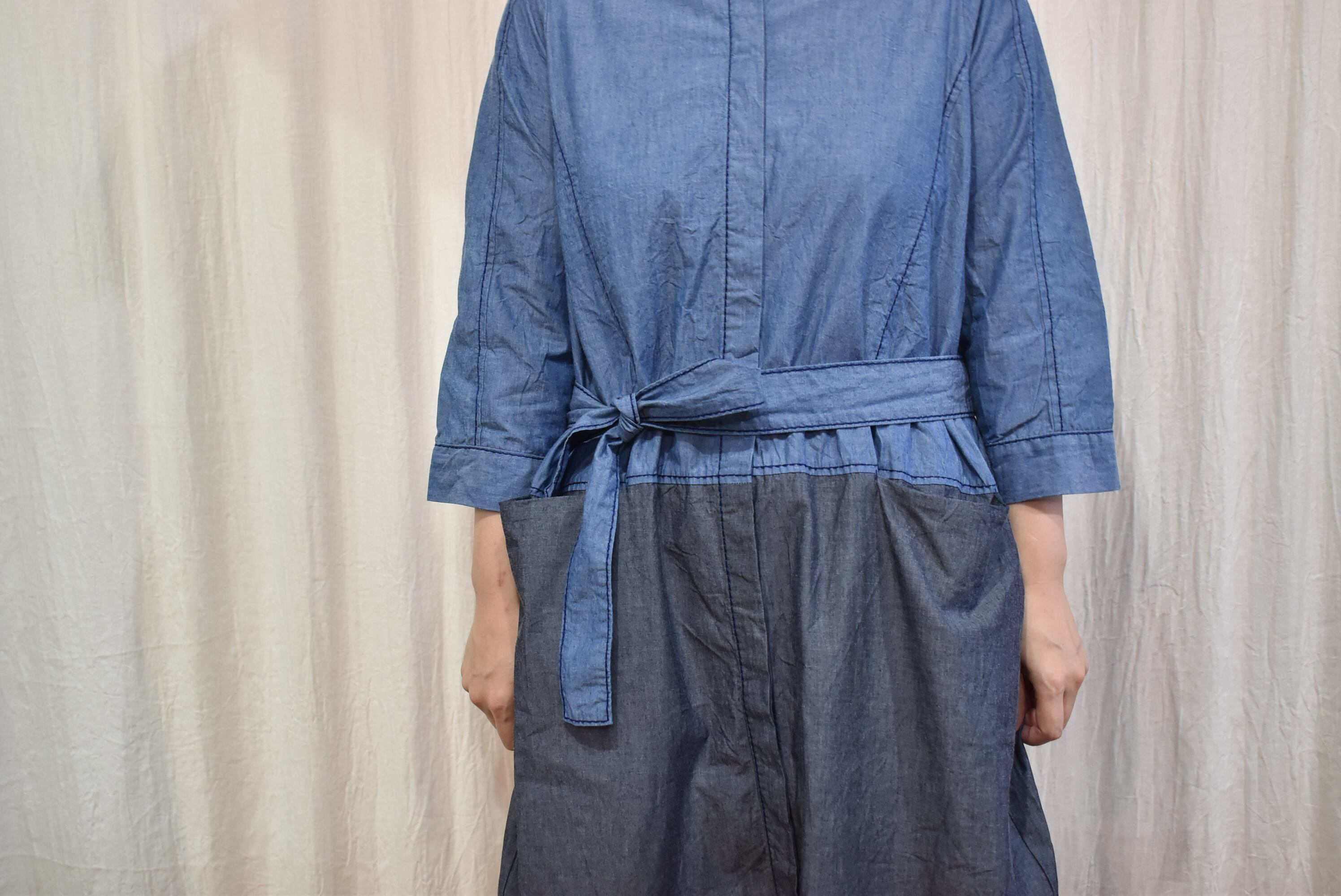 シャンブレーシリーズの第二弾。前開きの七分袖ワンピースです。