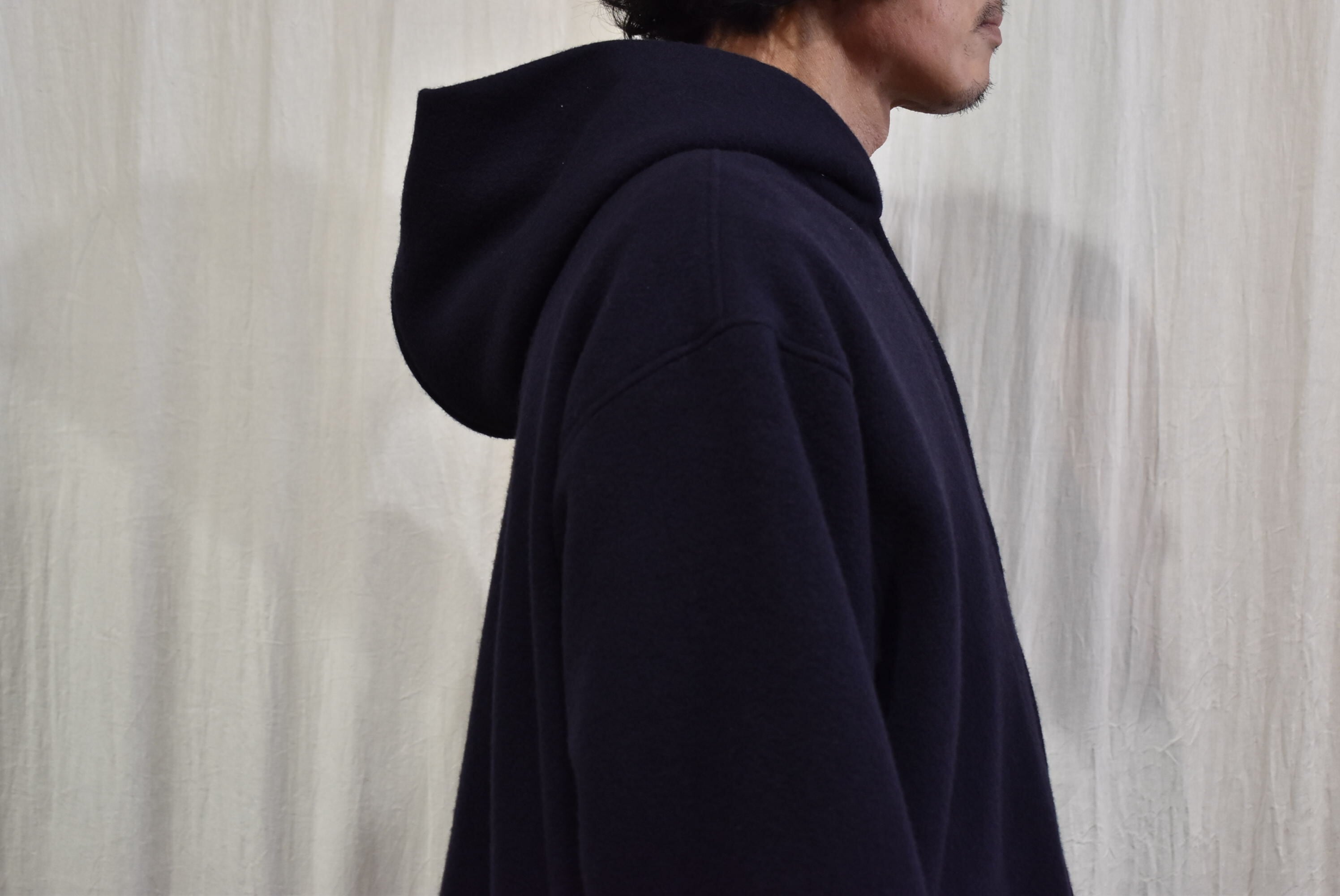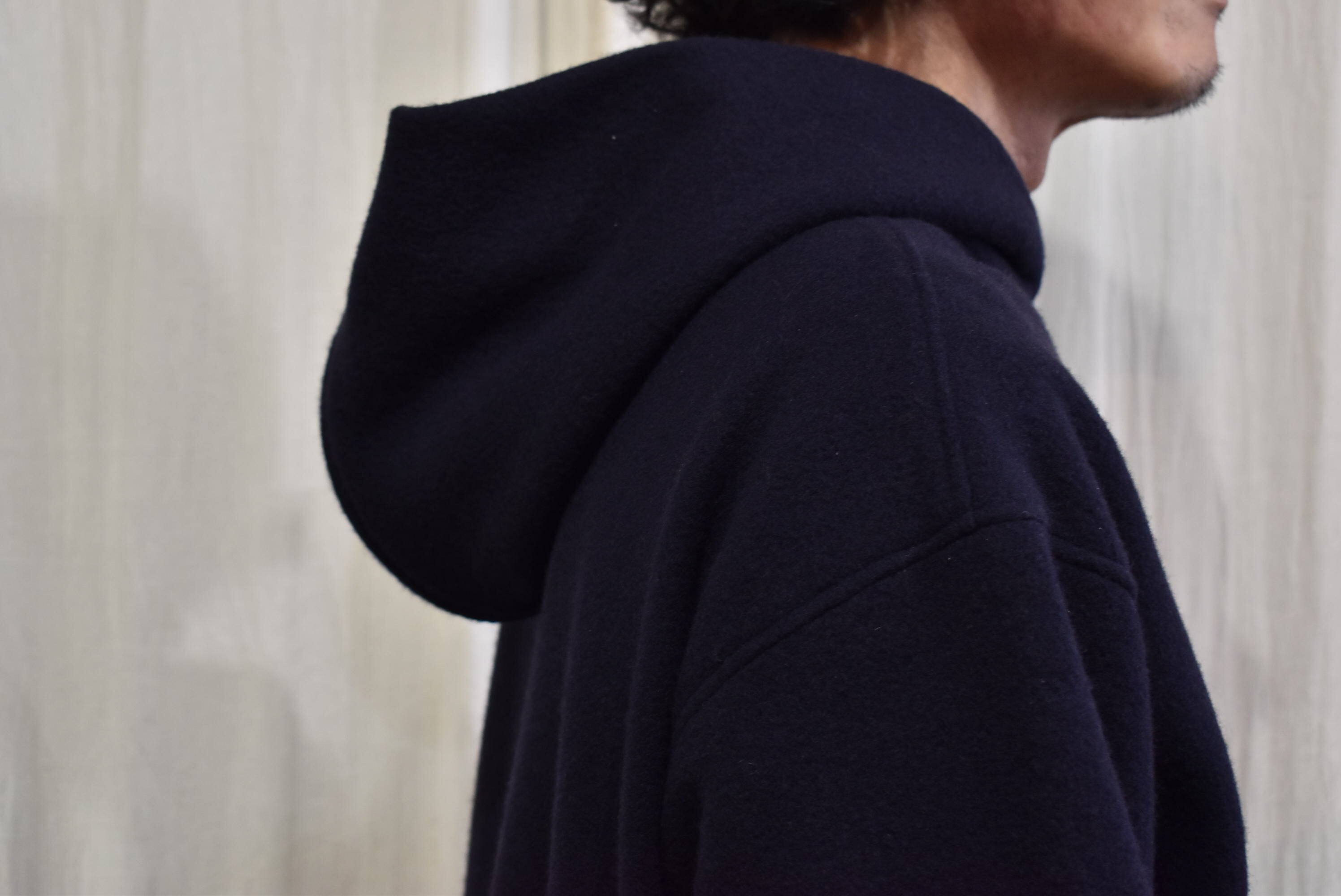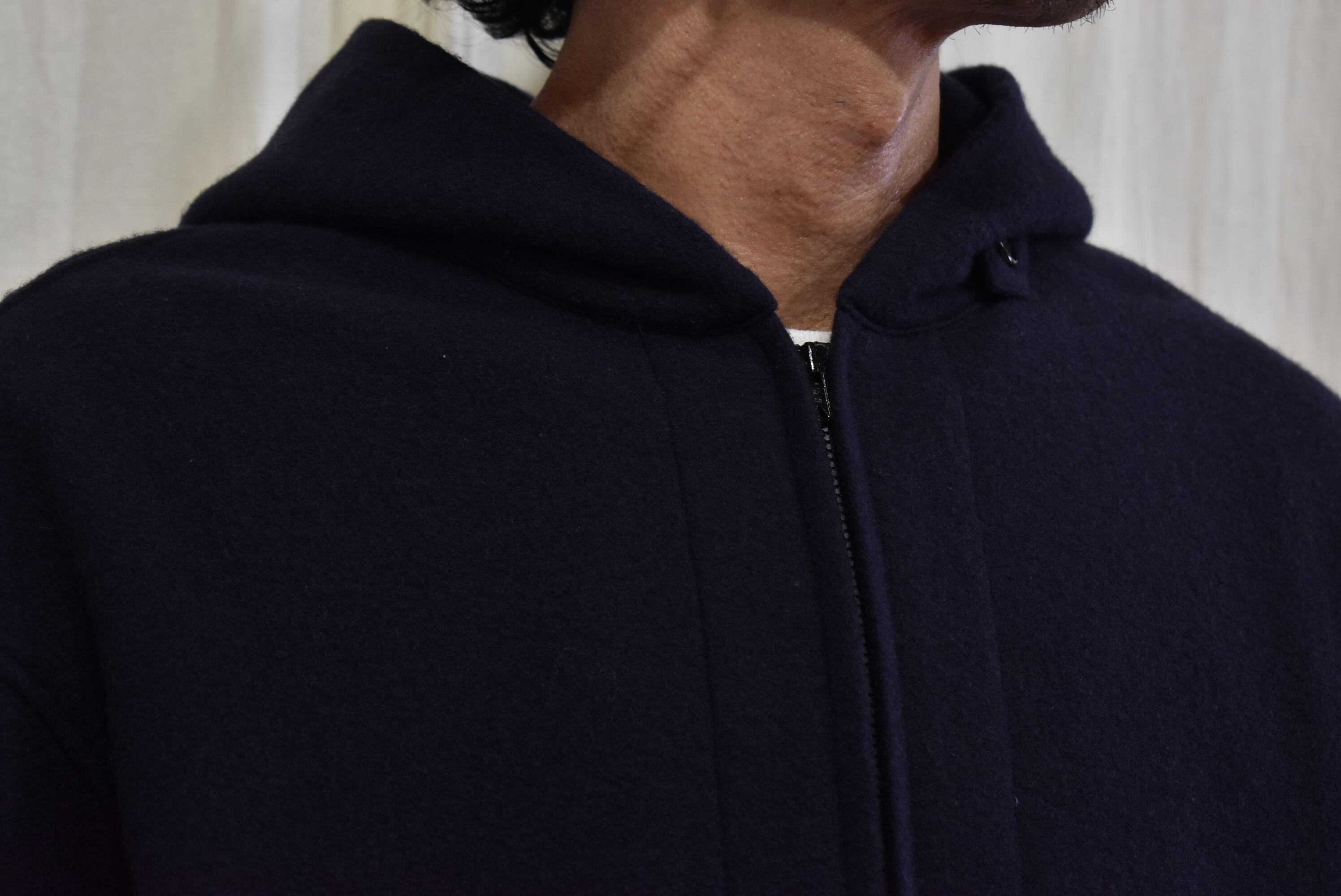 両面縮絨をしたウール素材を用いたガゼットパーカー。