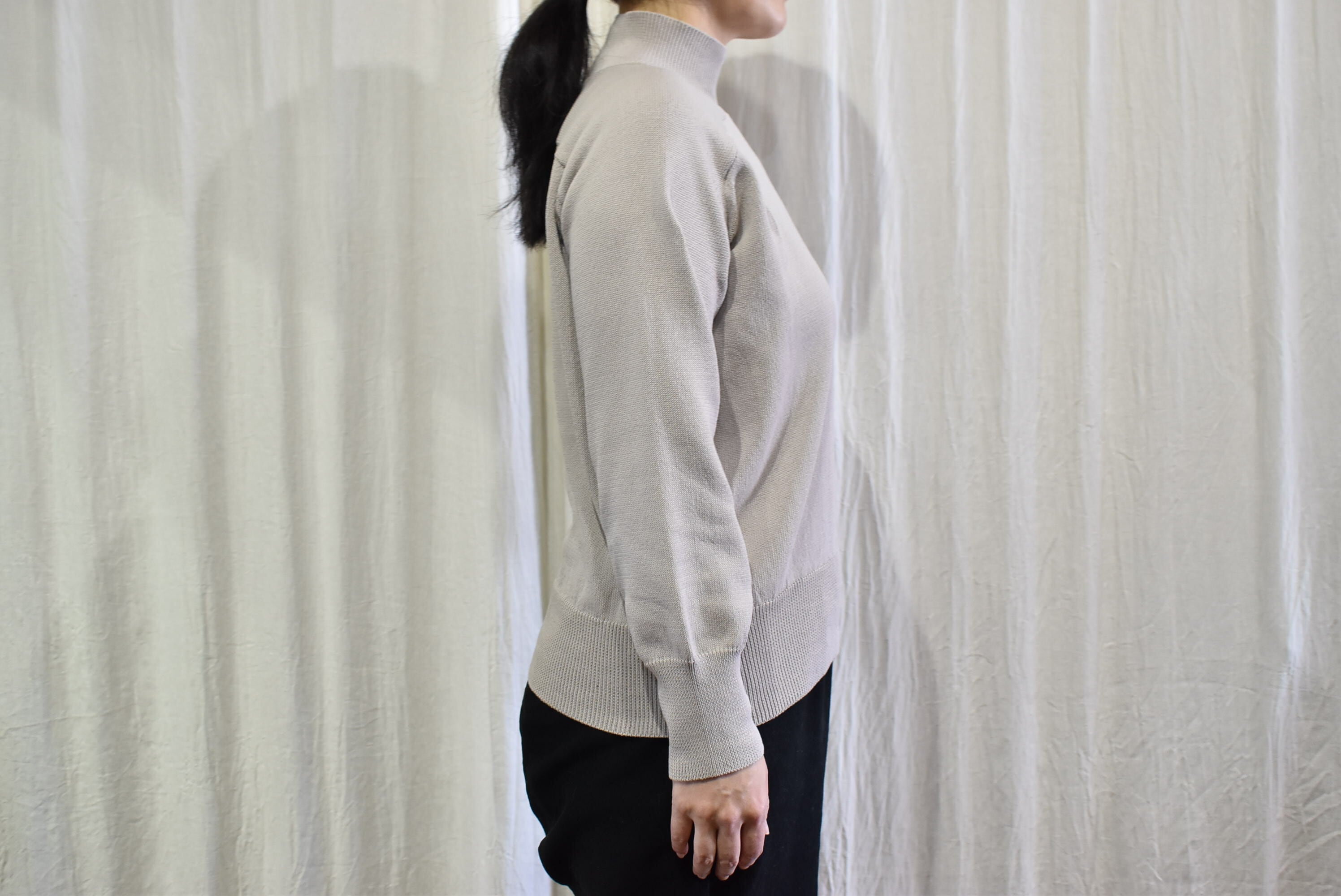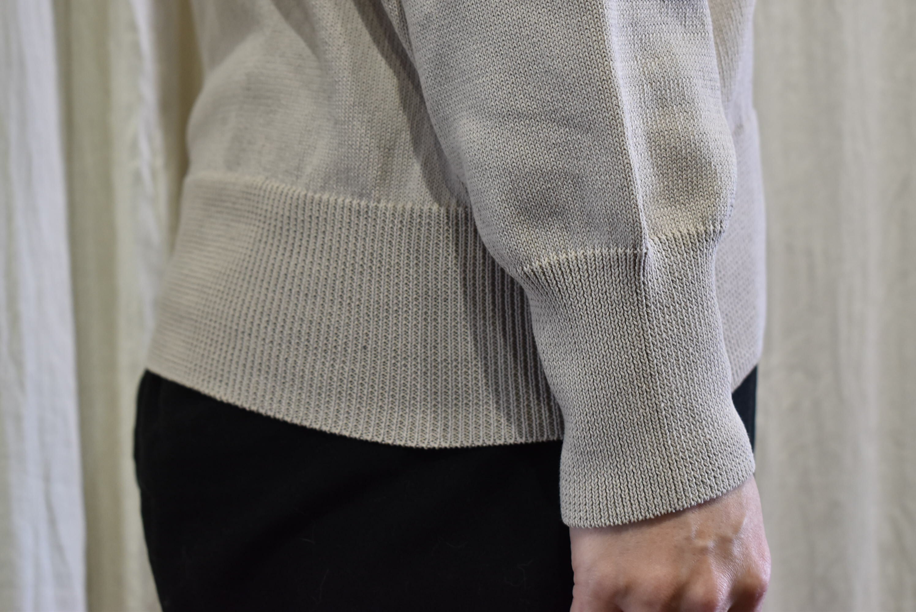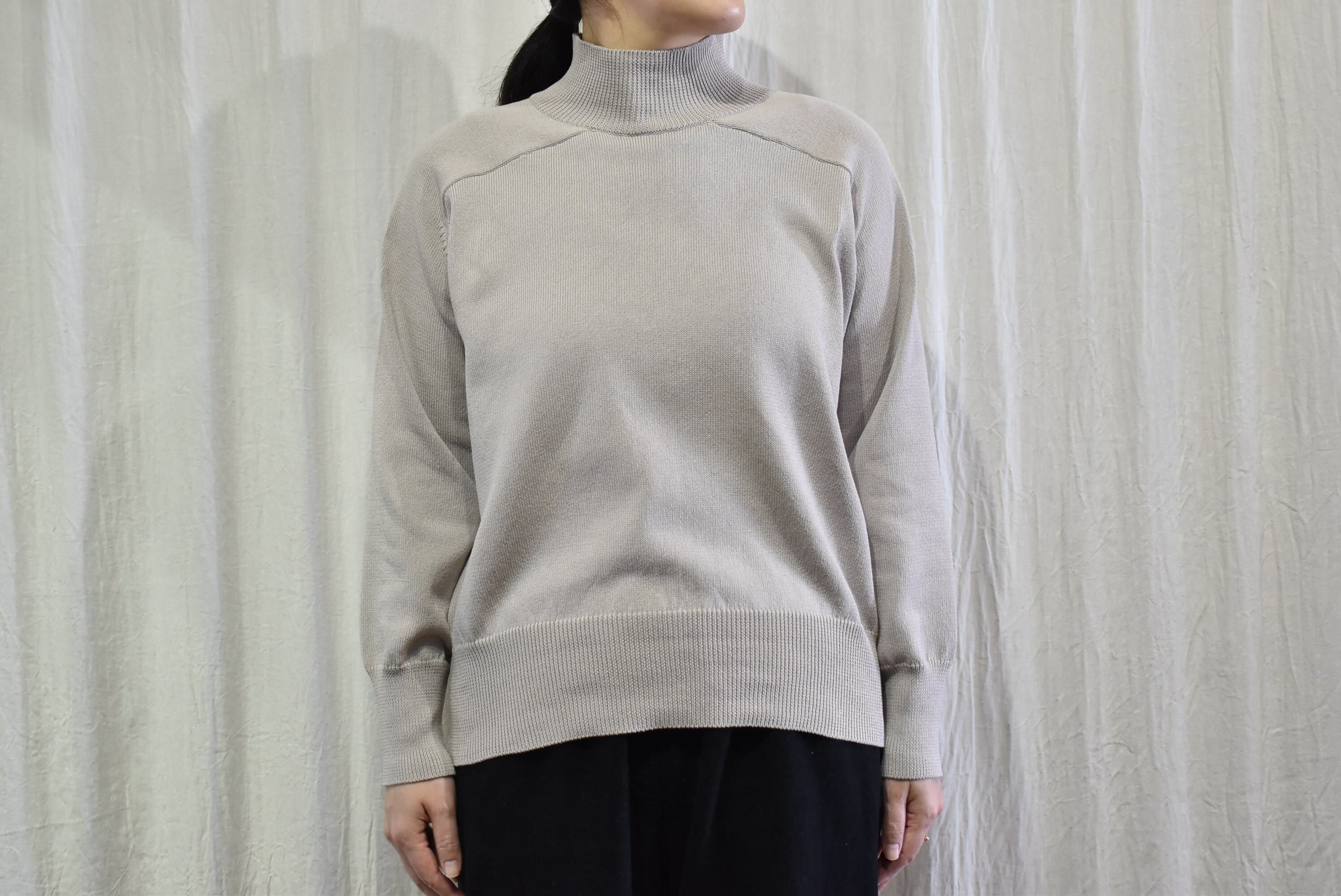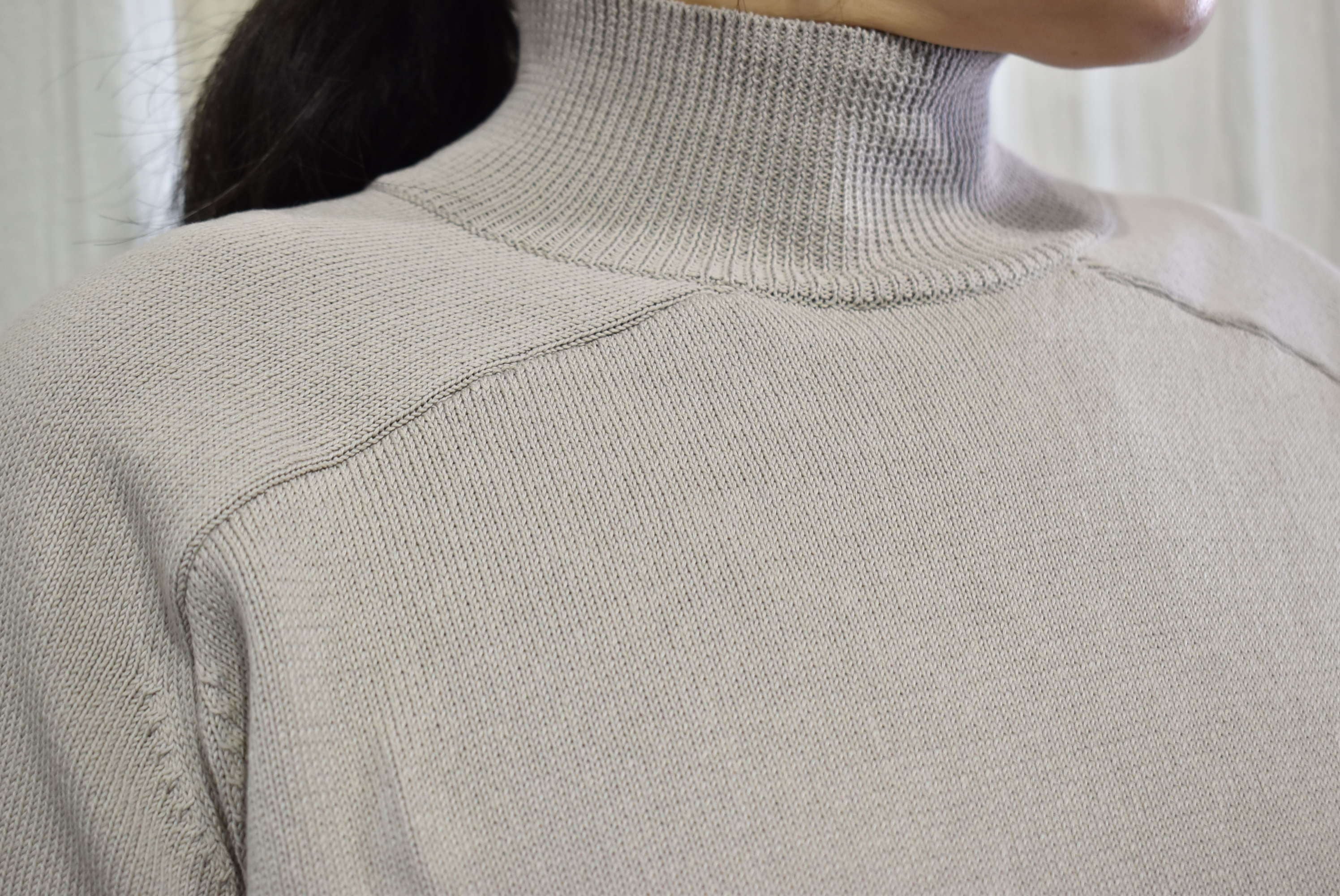 強撚糸のコットンを編みたてたハイネックタイプのセーター。