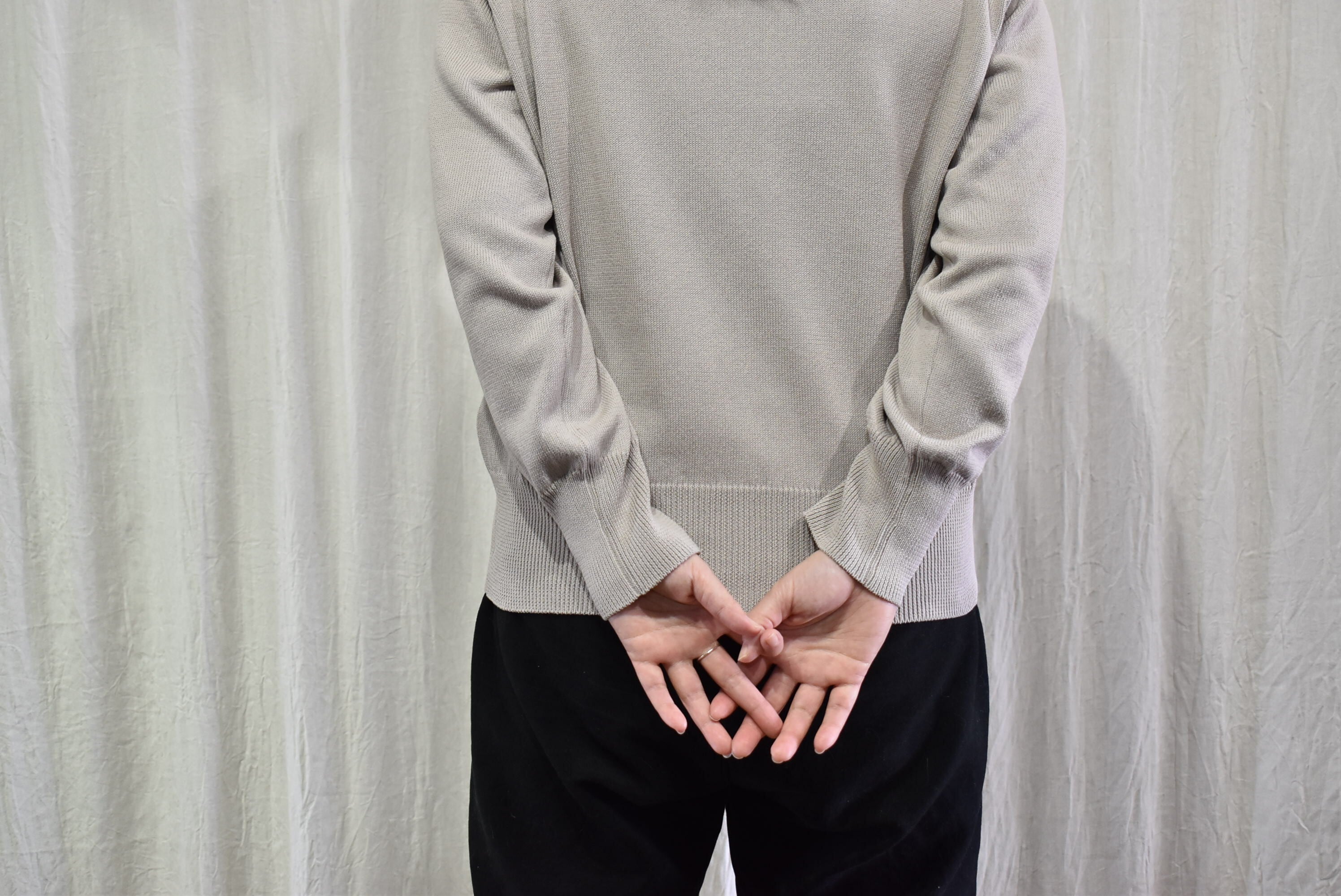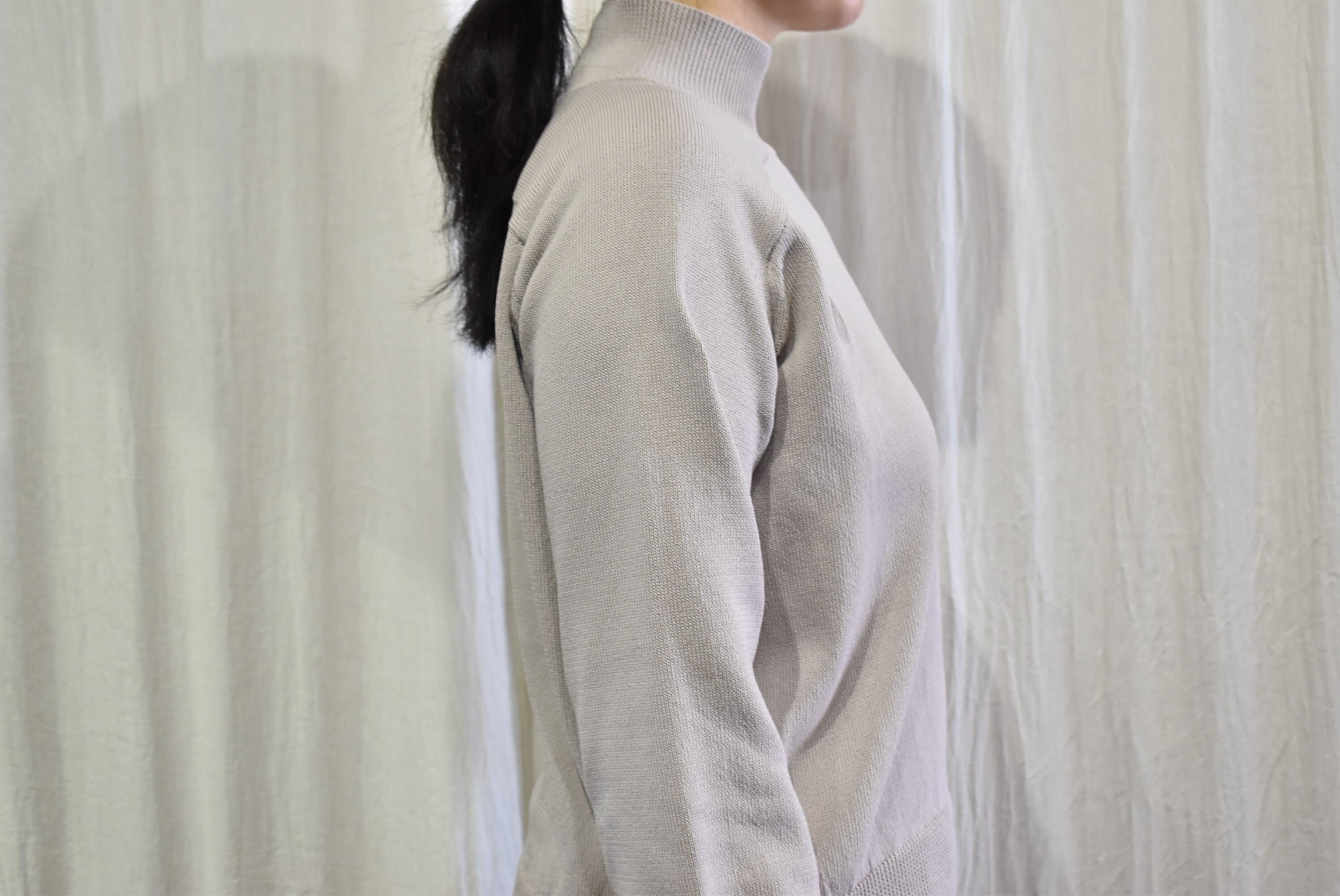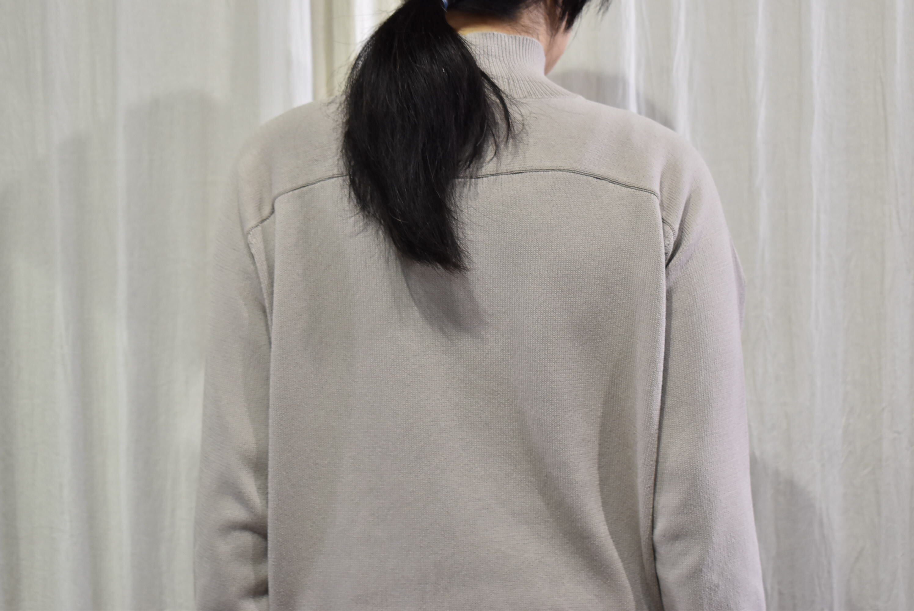 強撚糸のコットンを編みたてたハイネックタイプのセーター。