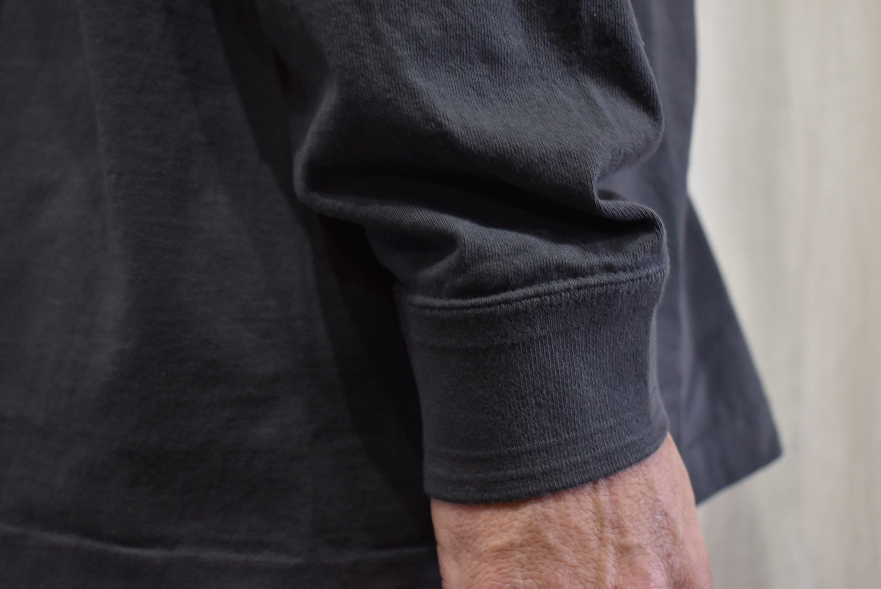 袖口は段リブ、ラグランの肩傾斜も絶妙なバランス。