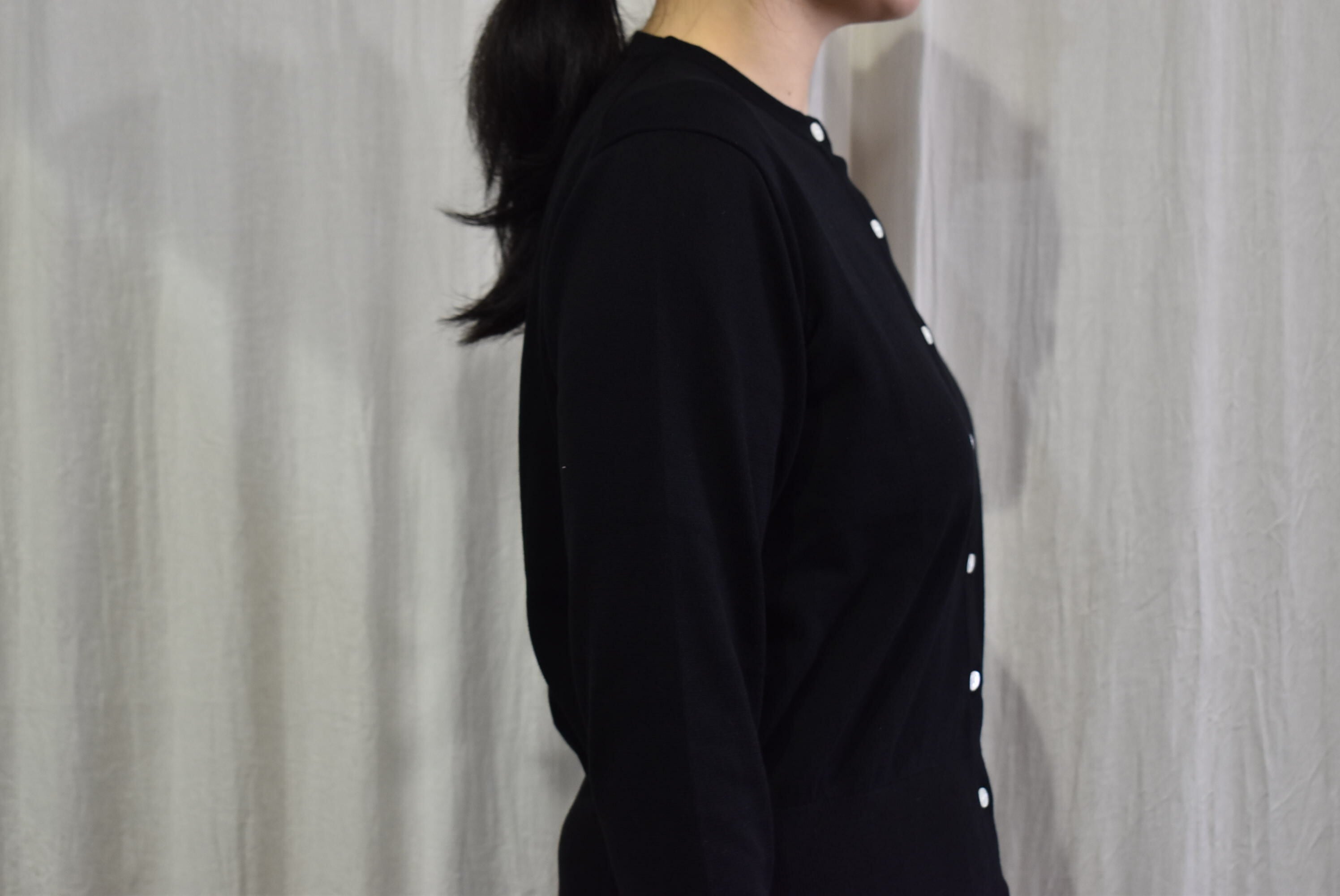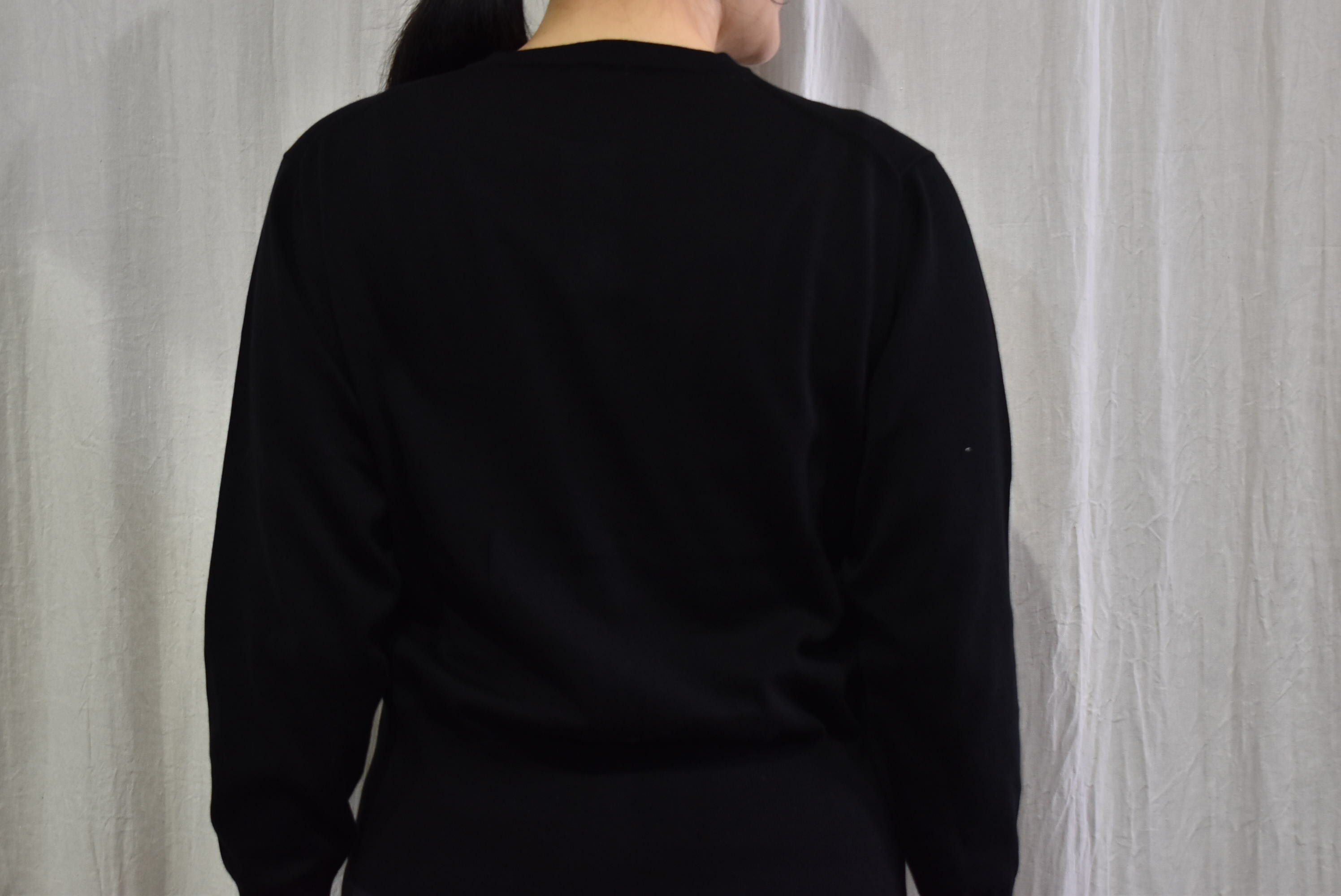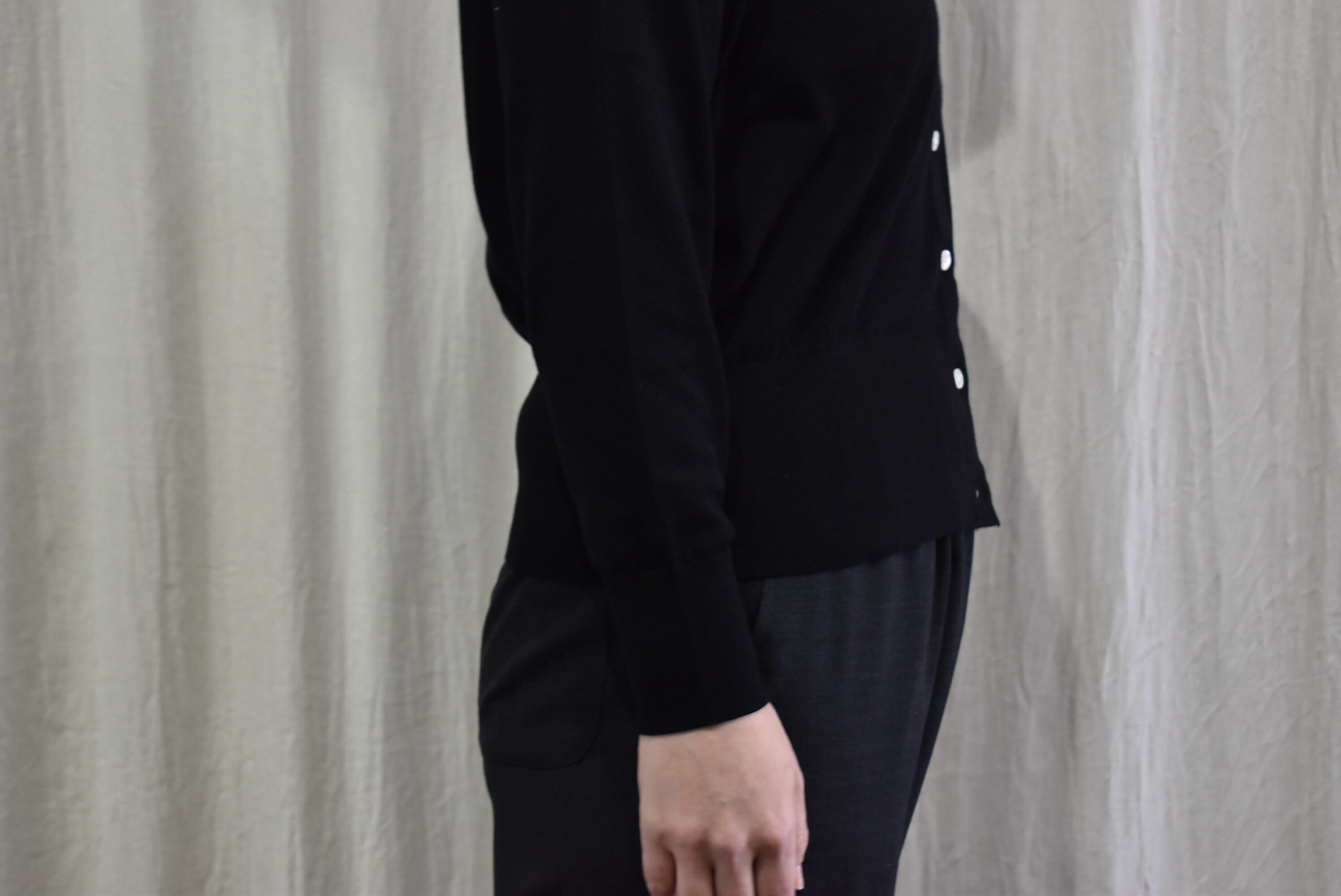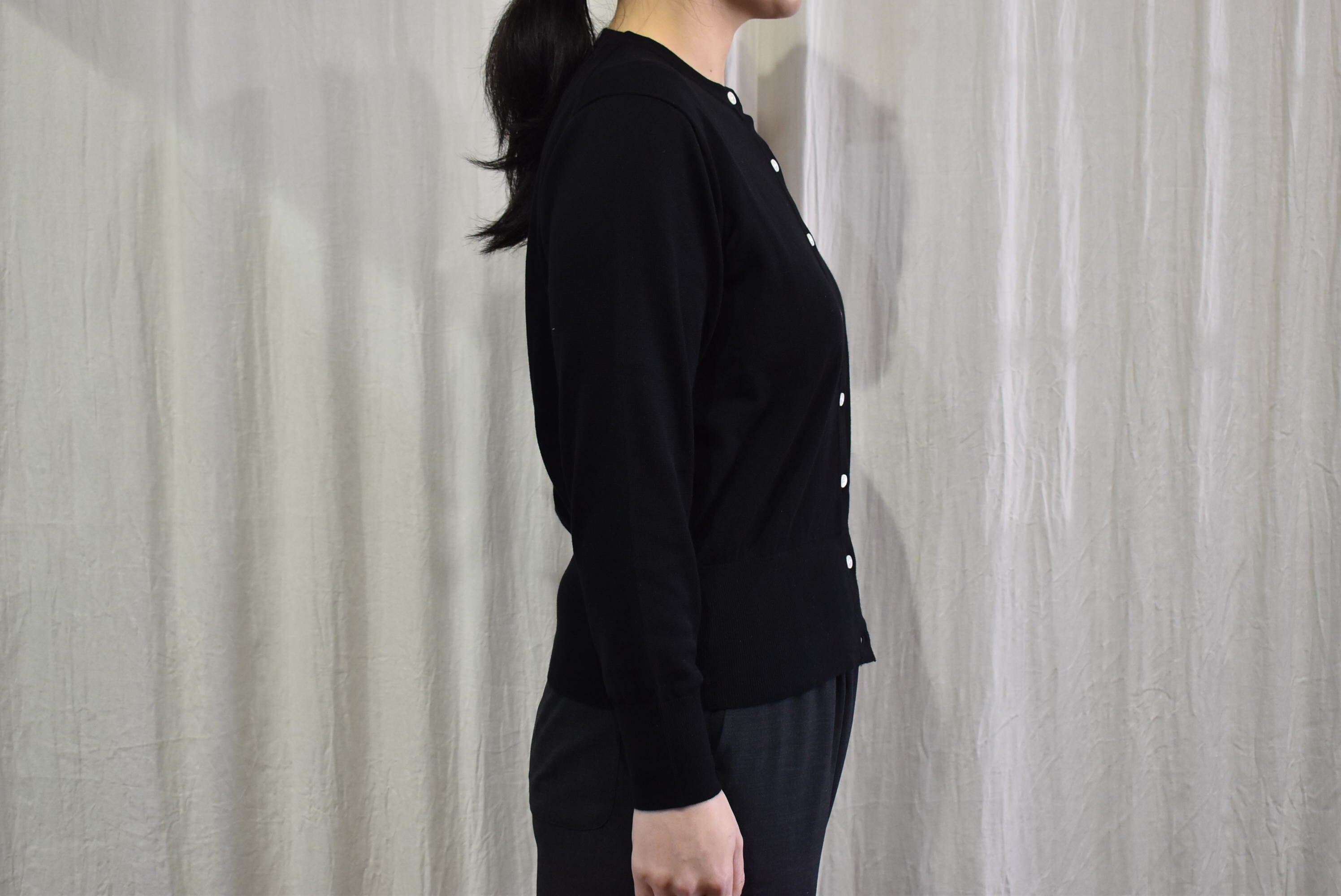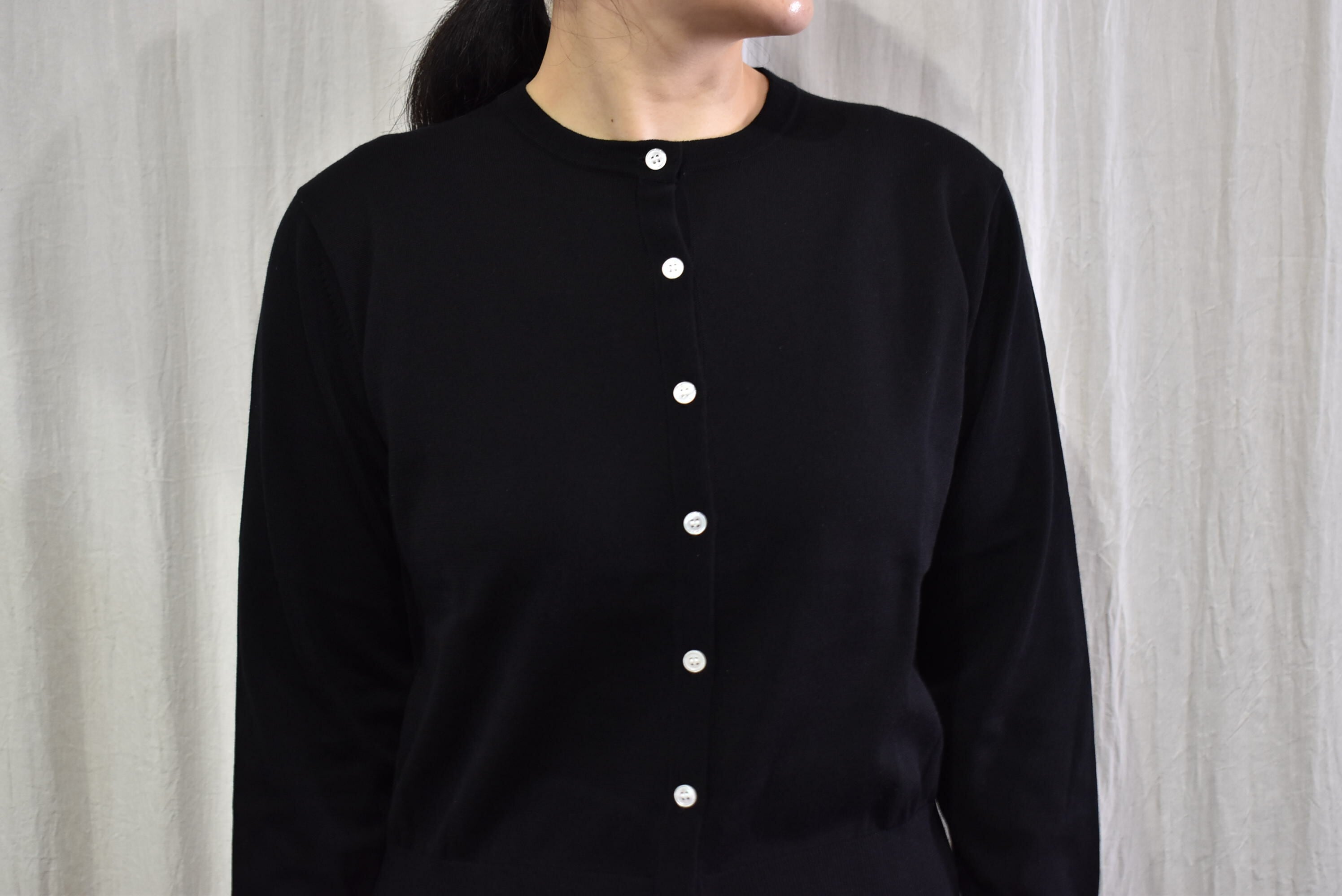 施したいとを用いたクルーネックカーディガン。