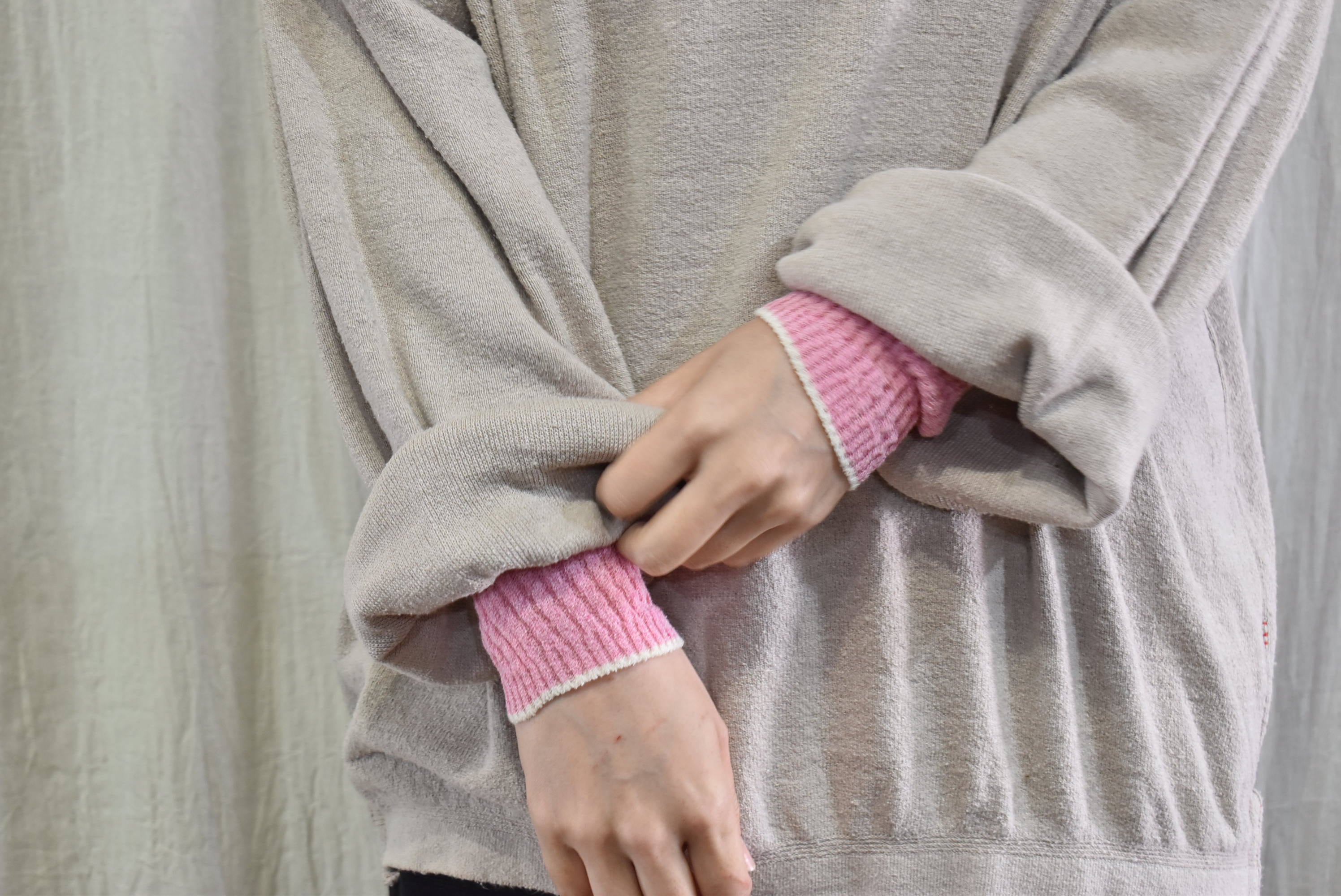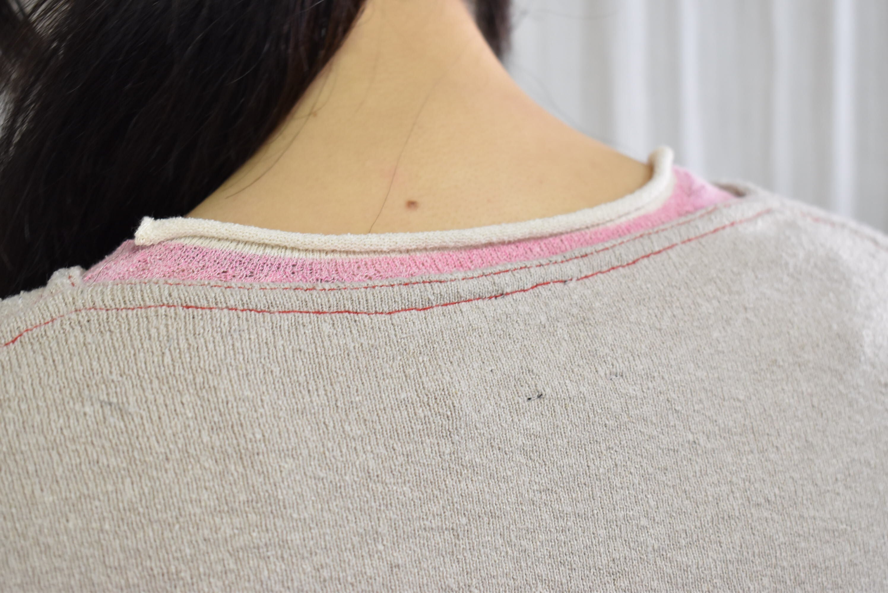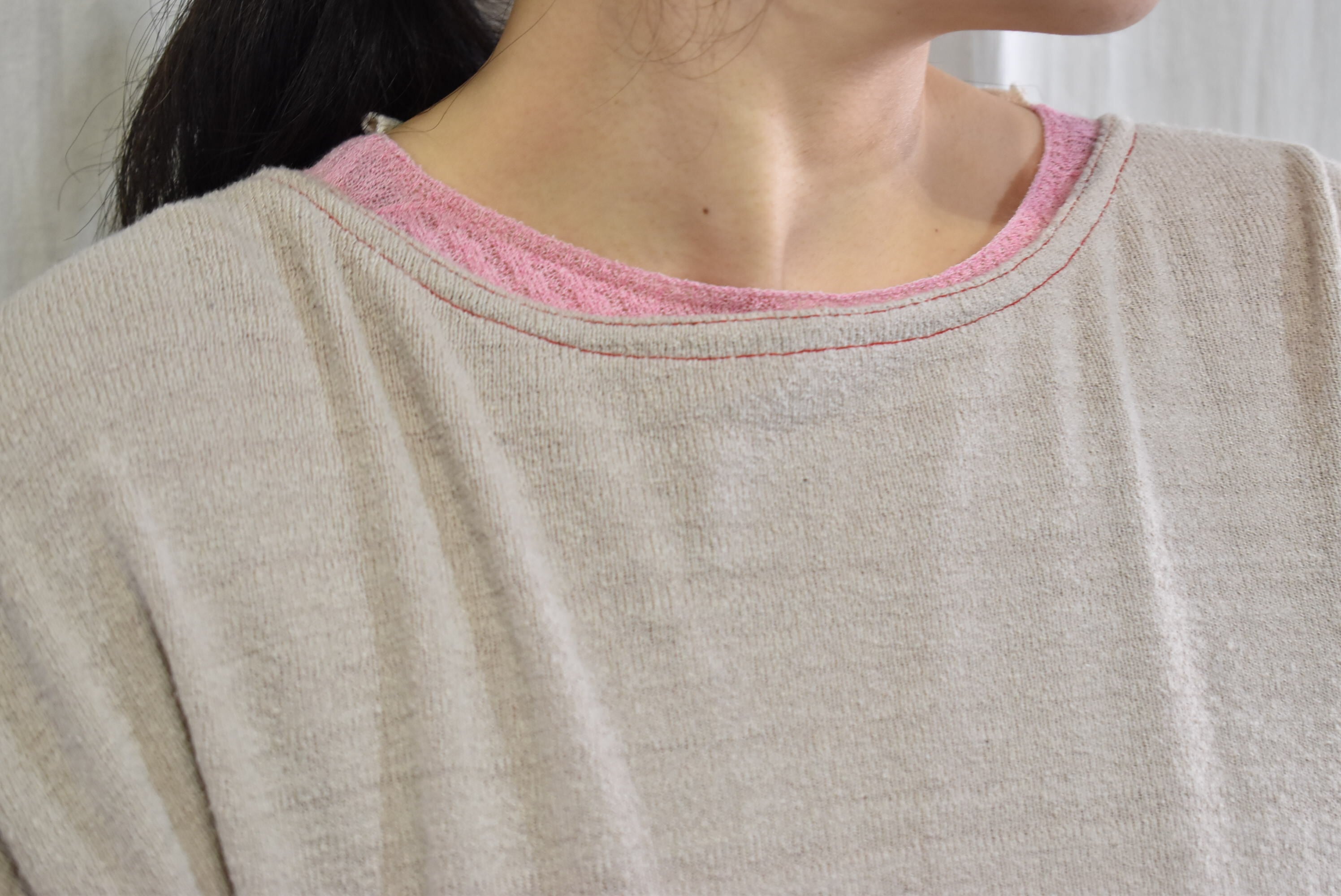 袖口と後ろのネックラインを配色にすることで、重ね着の際に