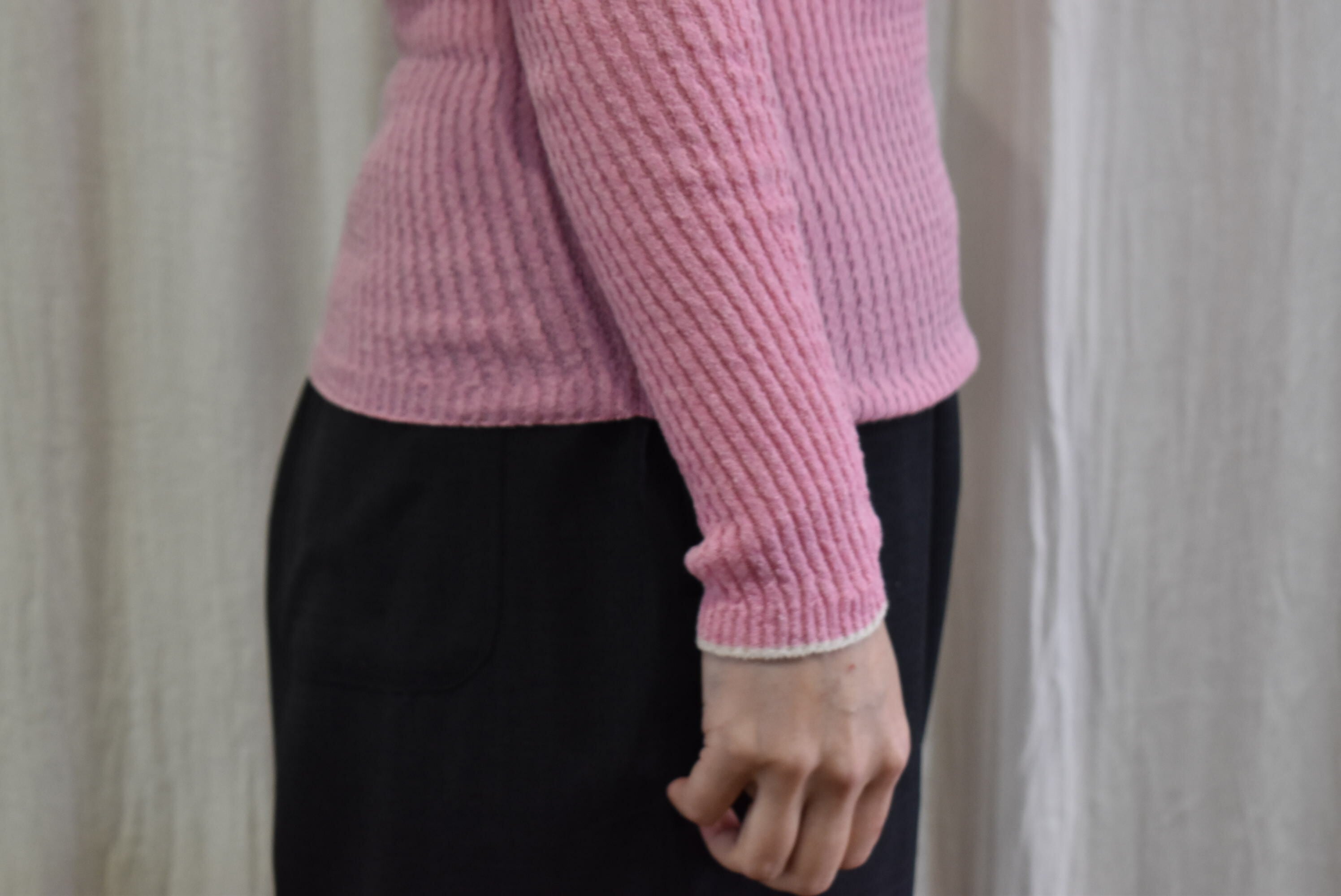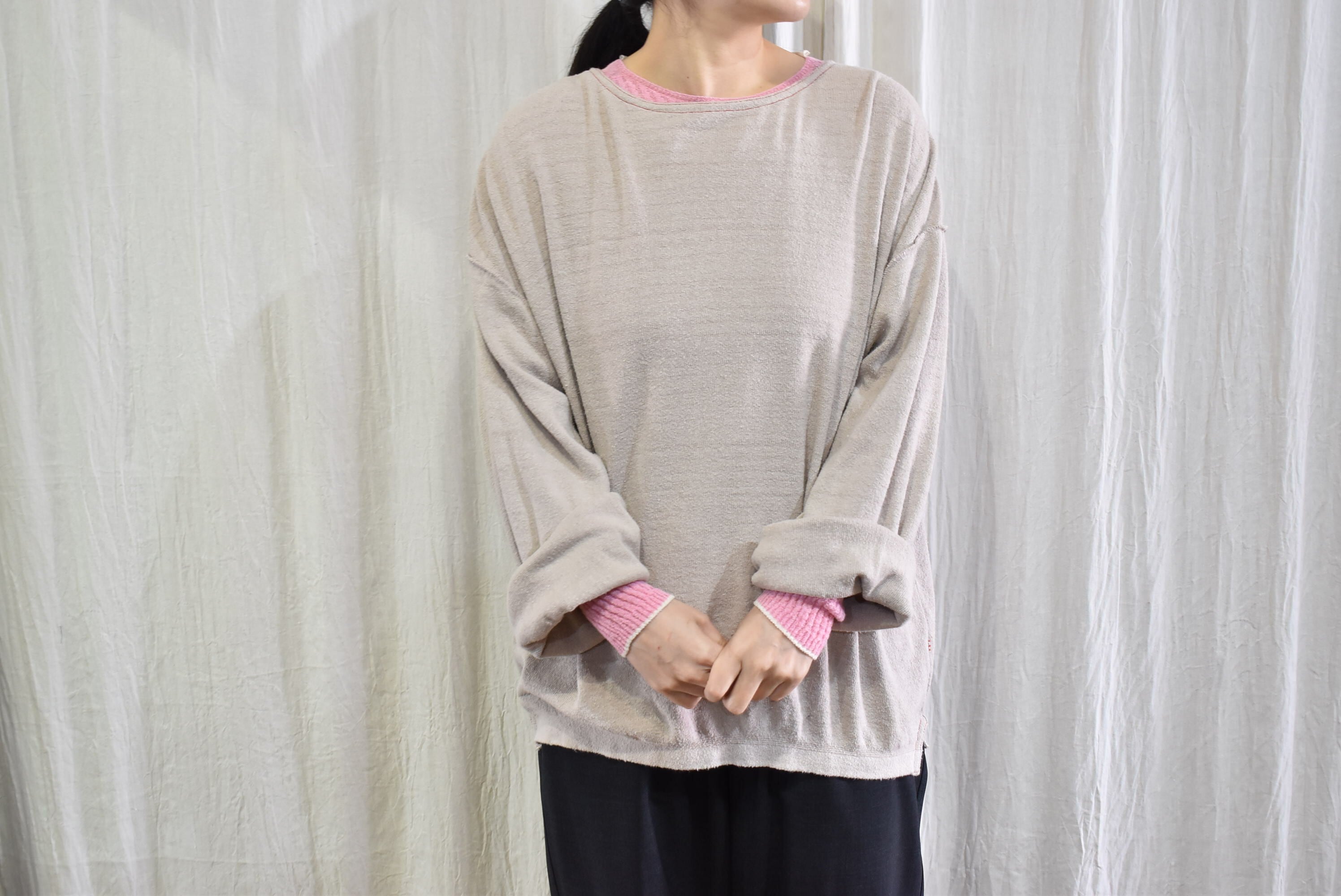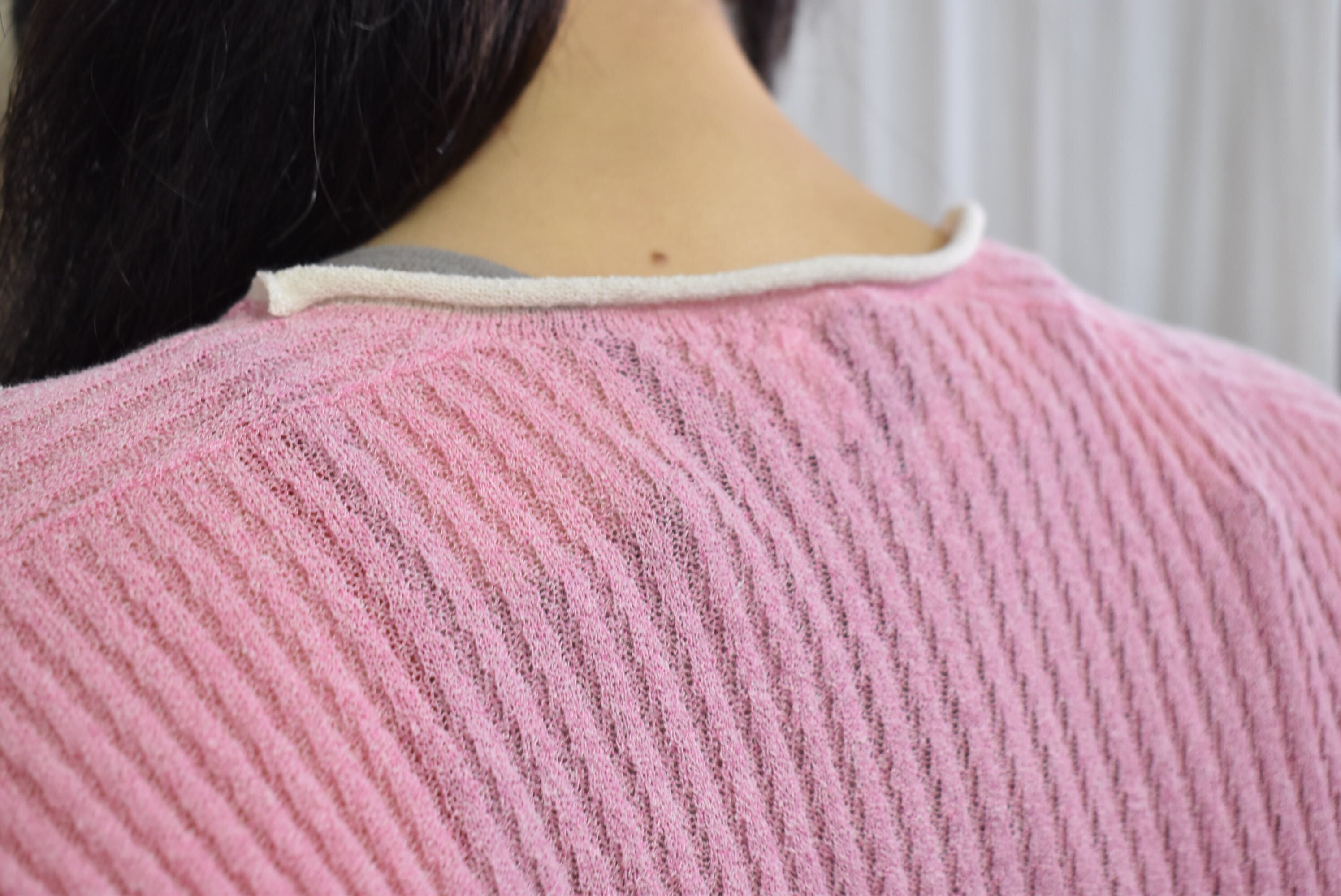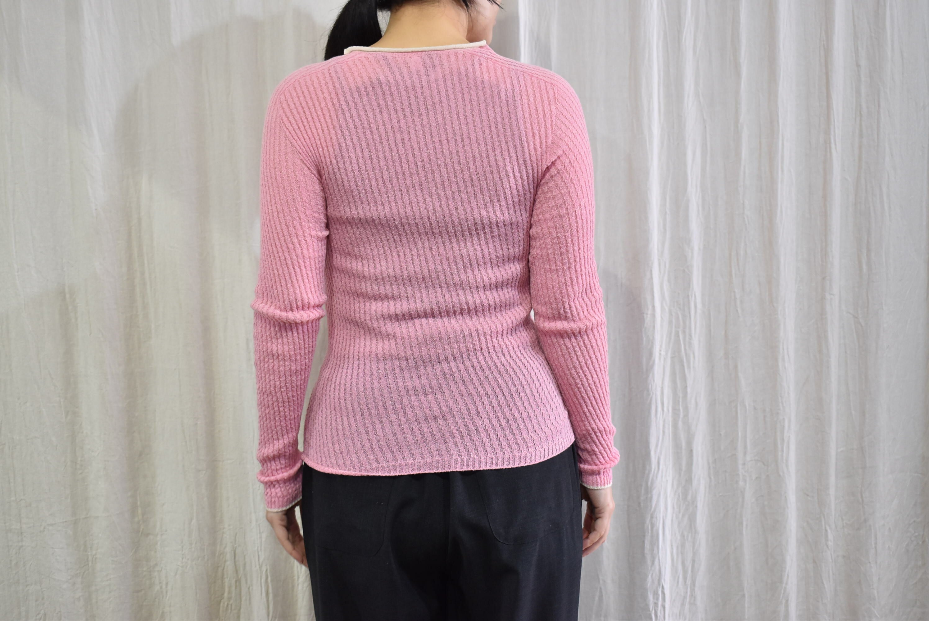 袖口と後ろのネックラインを配色にすることで、重ね着の際に