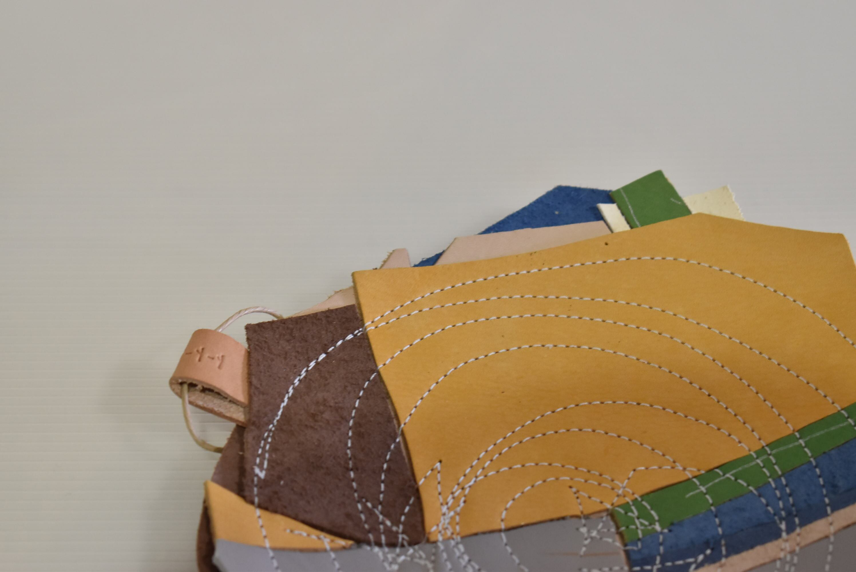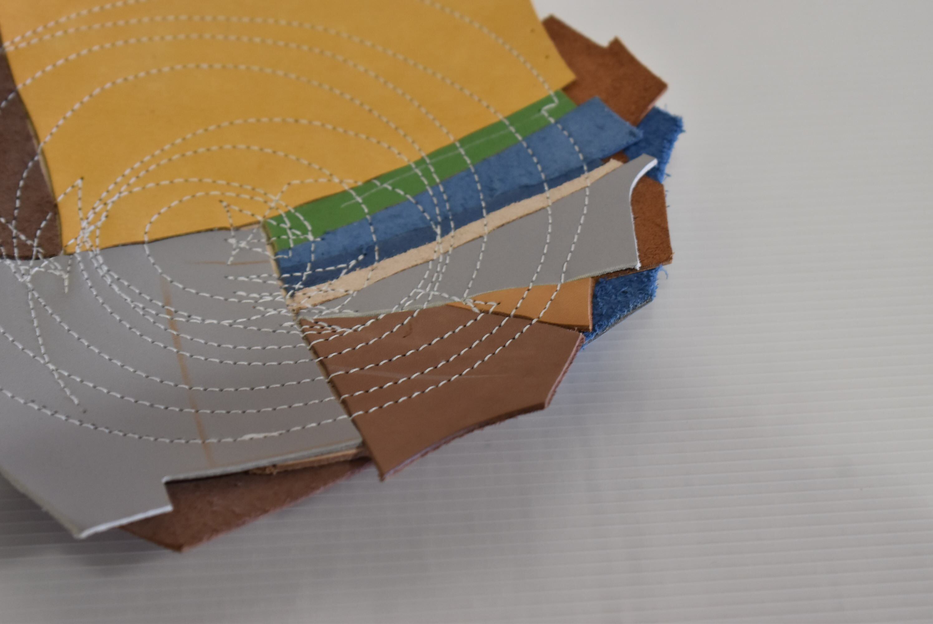 3層に重ねた革をリズムに乗るように縫い合わせています。