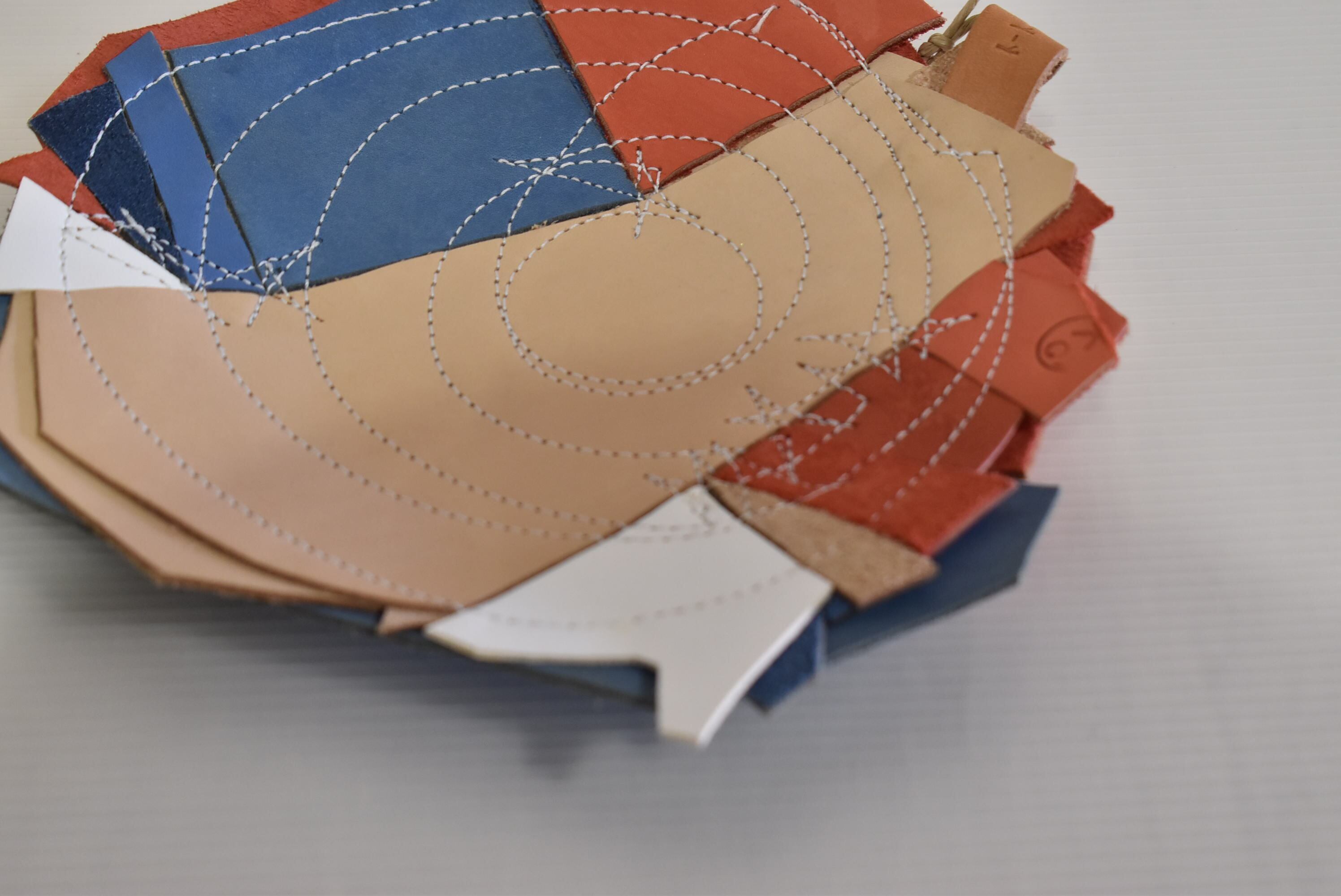 3層に重ねた革をリズムに乗るように縫い合わせています。